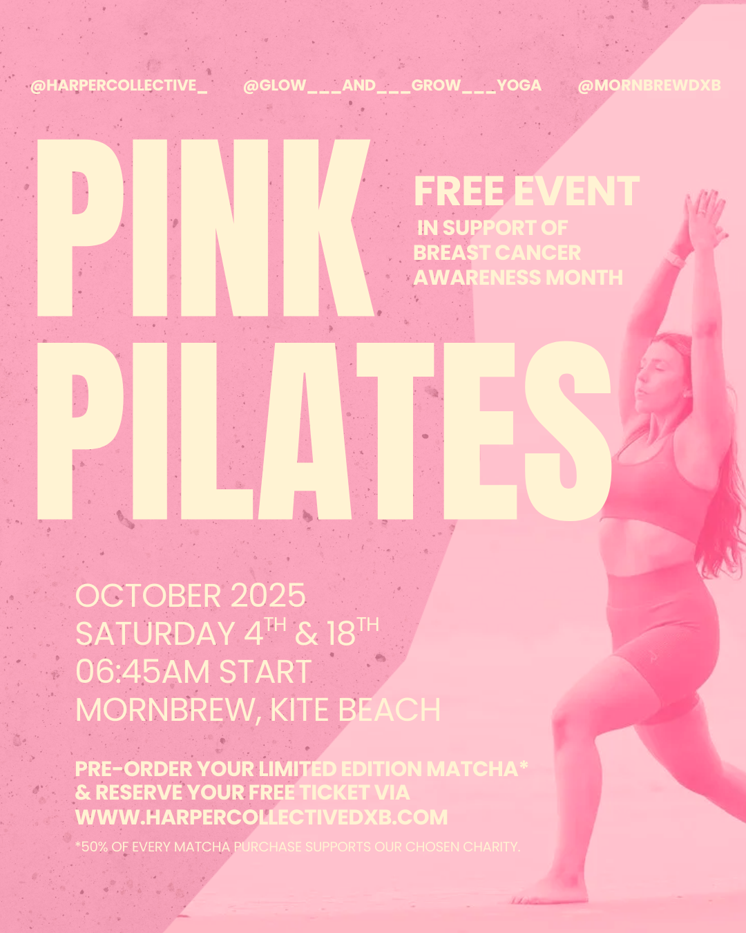 Start your day by moving with purpose. Join instructor Caitlin from Grow & Glow for a refreshing beachside Pilates session, in support of breast cancer awareness month.